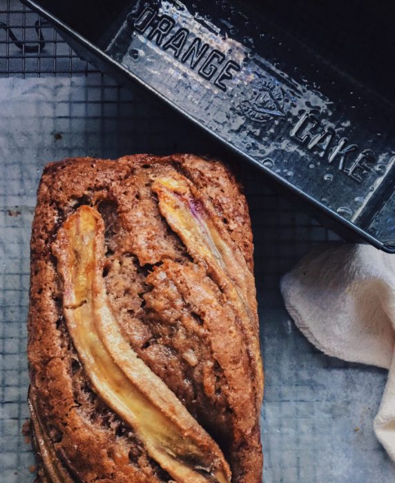 If there are any nut allergies in your family, simply omit the walnuts for a nut-free loaf! However, if nuts are not an issue, I highly recommend you add them in; the crunchy nut texture alongside the moist mushy banana sponge is heaven. Furthermore, once the batter has been poured into your prepared tin, ensure you place thin slices of banana on top as well as a generous sprinkle of demerara sugar. This will create food for the eyes, and the crusty coating from the caramelised sugar adds another level of crunch.