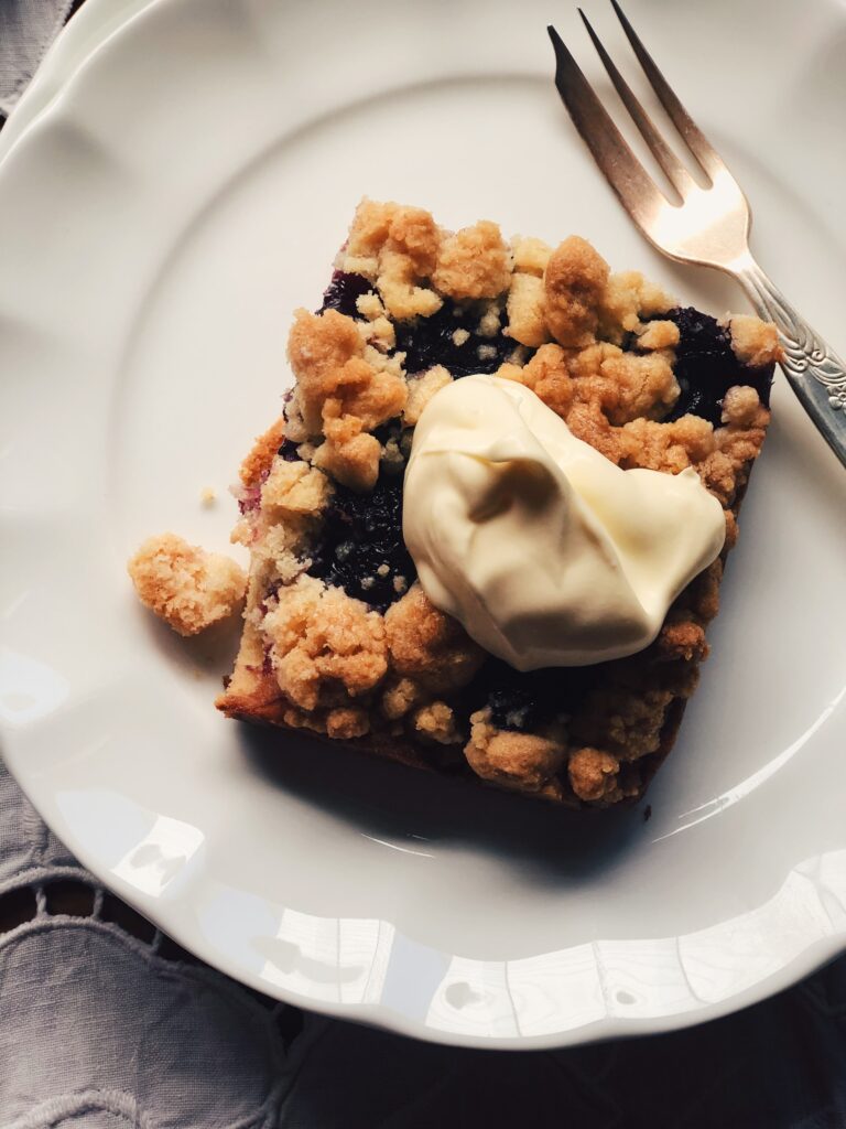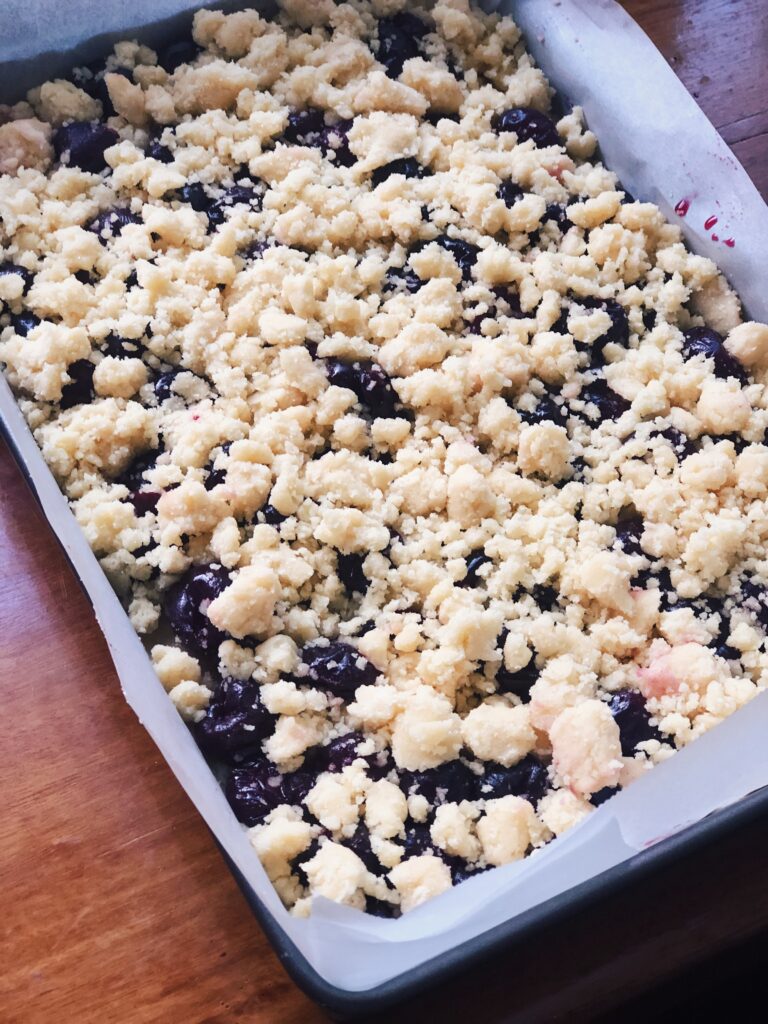 - Then crumble over the stewed cherries, small chunk size pieces of your pastry crumble. Leave little gaps in between to show case some stewed cherries.