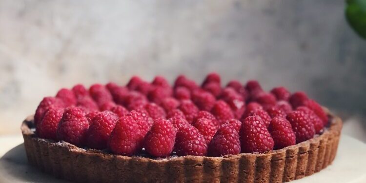 - To fill the tart; firstly spread the raspberry jam at the base of the cooled chocolate pastry tart. Now add in the mixed chocolate/raspberry filling and gently spread using a palette knife over the jam and ensuring to fill-in the entire tart area. Bake this in the oven for 30 minutes or until the filling is set. Leave to cool completely.