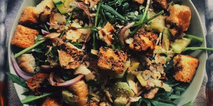 Stale bread cut into cubes, drizzled with olive oil and roasted in a hot oven to create a flavour sensation. Now here is an ingredient that I recommend you don’t purchase from supermarkets but prepare yourself. Essentially, it is super simple to make, taking no time at all, using up dry/stale bread which would otherwise been through away in landfill. Not to mention how tremendously delightful it is to munch on crunchy homemade croutons in a salad. I’ll just deviate slightly here with my other favourite way to eat croutons – soaked with lashings of fresh tomato juice, chunks of tomatoes, thin slices of red onion, pinch of sea salt and a generous amount of extra virgin olive oil. Please don’t let your dry/stale bread go to waste! Follow my simple instructions and you will have homemade croutons (or breadcrumbs) to biting salad.