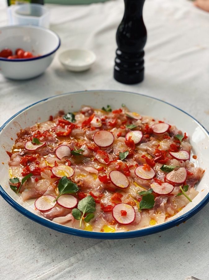 Kingfish carpaccio; a dish I would certainly eat everyday throughout summer if I could! It’s light, clean, and it’s naturally sweet flavoured flesh serves perfectly raw as sashimi, sushi, ceviche, or as I do here; carpaccio!