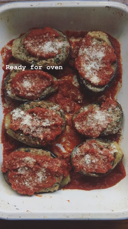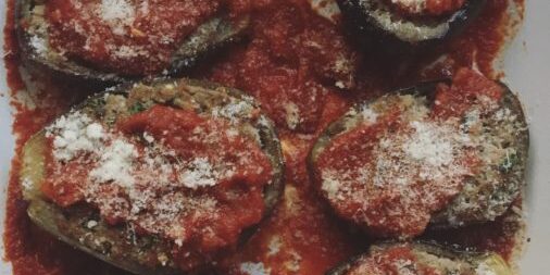 Essentially, eggplants are halved, inside flesh removed, both boiled and then it’s refilled with a mixture of mince meat, cooked eggplant flesh, breadcrumbs, grated pecorino cheese (sheep milk hard cheese), eggs and herbs. They are pan fried and then baked with tomato sugo.