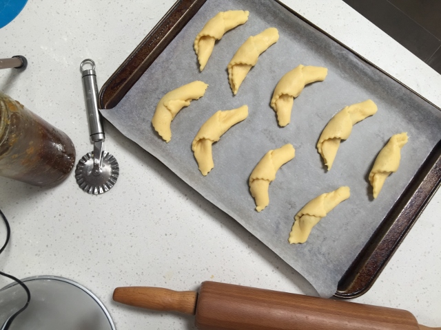 - Cut each circle into six triangles and place half a teaspoon of jam (or nutella) on the widest part of the triangle. Fold the pastry over the filling and press down to seal in the filling. Then continue to fold over until you get to the tip and curl the ends to form a crescent shape. Continue until you have used up all the dough.