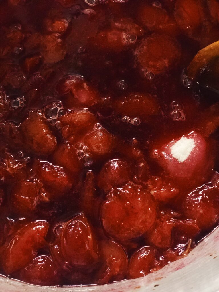 - Place the plums and water into a preserving pot and bring to a gentle simmer to soften the skins of the plums. This may take anywhere between 10 to 20 minutes depending on the ripeness of your plums.