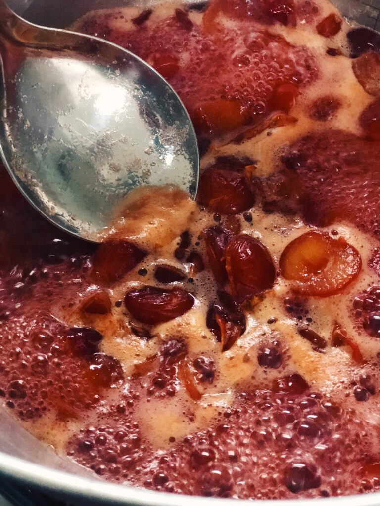 There are copious amounts of information available to those seeking the skills and techniques to make jam. I know this because I have read a great deal of it! Consequently, I feel there can be too much information sometimes, which can cloud the simplest of tasks. Of all the stone fruits to jam, I believe that plum is the easiest! Plums have a considerable amount of natural pectin which assists in the setting of your jam. Thus, you only really need to add some water and sugar to make plum jam. The addition of the water is to help soften the skin of plums while cooking; before adding the sugar. If not, the sugar hardens the plum skin and will result in rubbery hard skin plum jam.