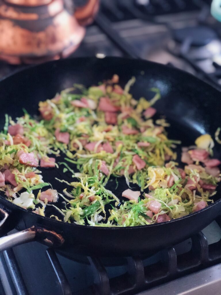 - In a large fry pan, heat olive oil over medium heat. Add the eschalots with a good pinch of sea salt and allow to cook for a few minutes - until translucent. Add the bacon and cook for 2-3 minutes. Then add in the garlic, brussels sprouts, shallots, seasoning and cook for 3 minutes until brussels have wilted.
