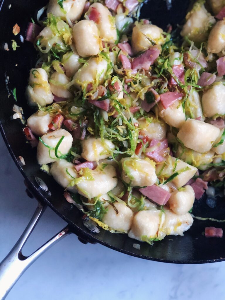 ricotta gnocchi with brussels sprouts, garlic, bacon & almonds