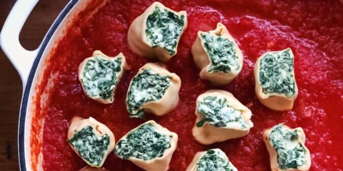 I love to make fresh pasta dough from scratch & roll sheets out using my pasta machine, but shop-bought fresh pasta sheets will work just as well! If you use purchased pasta sheets, just blanch them in a pot of boiling water for 20 seconds and cool a little before using.