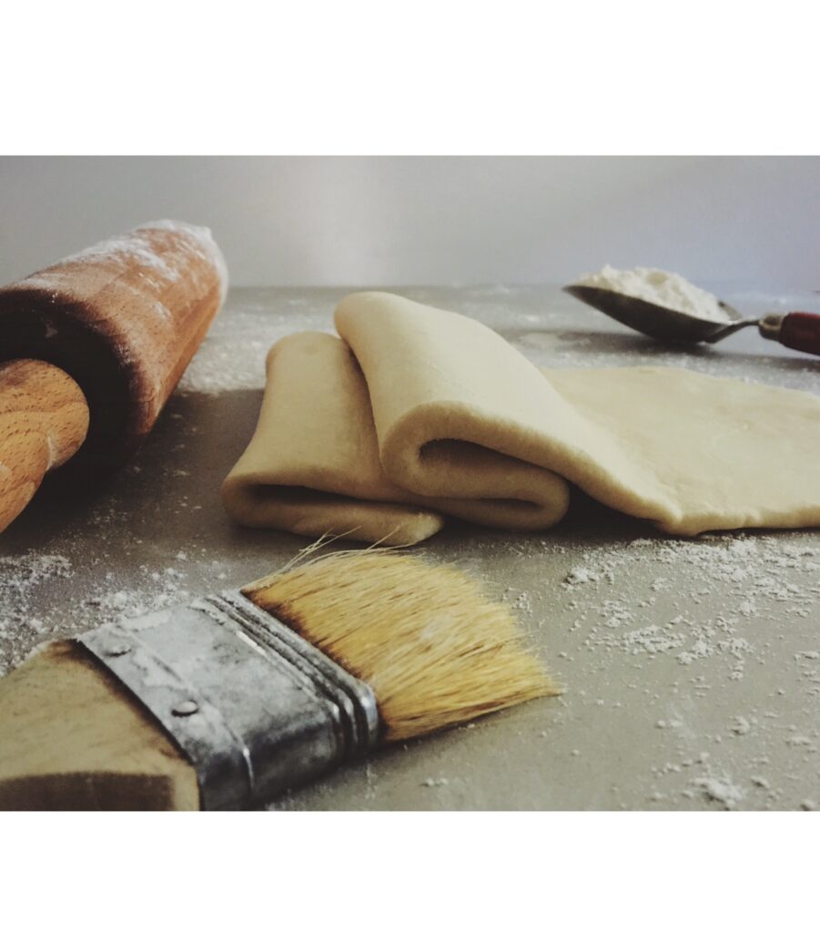 Rough Puff Pastry is an easier way to make a true puff pastry and is often called or known as a ‘cheats’ version of puff pastry. Large knobs of butter are mixed through dough and the dough is then rolled and folded to spread the butter through the dough. The result is uneven layers and the dough will rise to about twice its thickness when baked, which is much less then proper puff pastry. Whilst it may not rise as much as your standard puff pastry, it is far simpler to make and promises a flaky buttery bite. I use this puff pastry for most of my pie & sausage roll recipes.