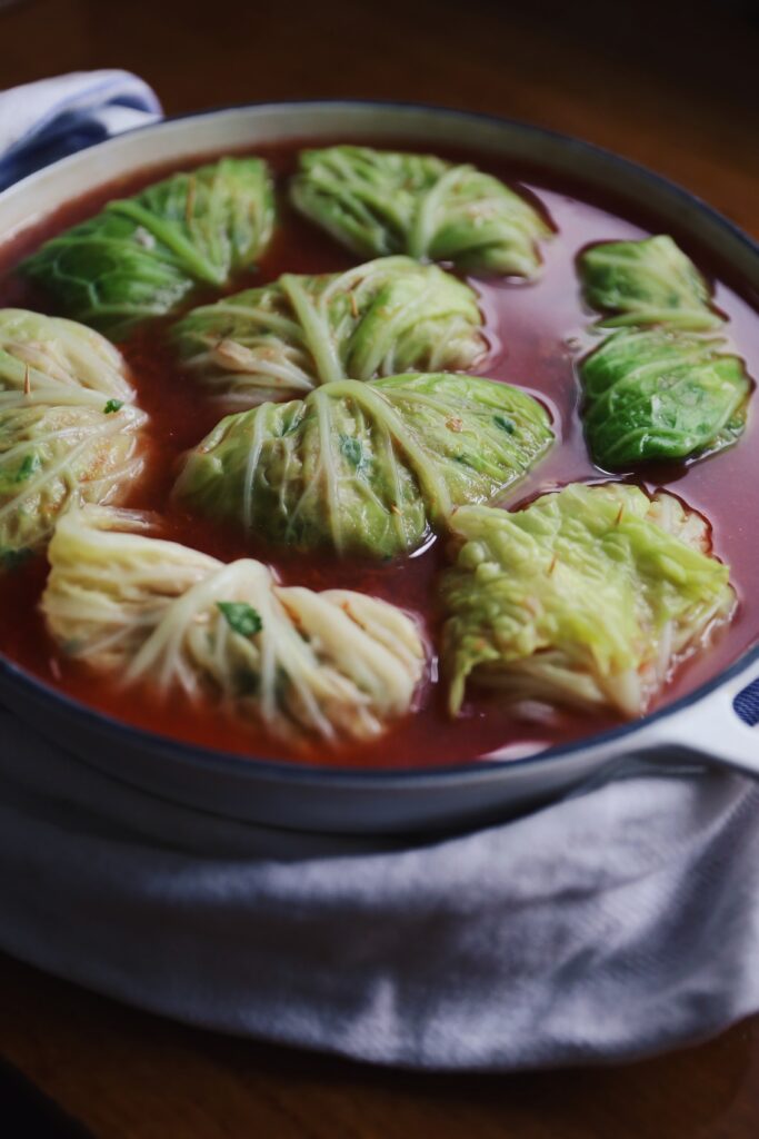 Stephanie Alexander shares her mother’s recipe for cabbage rolls in her cookbook, ‘Recipes My Mother Gave Me’. Stephanie’s mother uses a different protein altogether; beef mince and other herbs such as thyme & marjoram. Stephanie’s recipe stresses the importance of adding cooked rice – not leaving it raw as that would make it stodgy. I didn’t even know that was a thing, so yes, make sure to add cooked rice to your mixture.