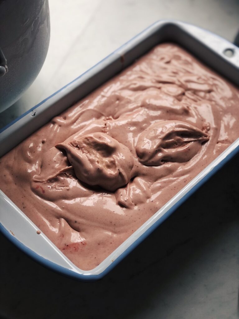 - Transfer the mixture to an ice cream maker and being the churning process. Once it begins to set in the ice cream maker, transfer into a loaf tin container to freeze for about 6 hours or overnight.